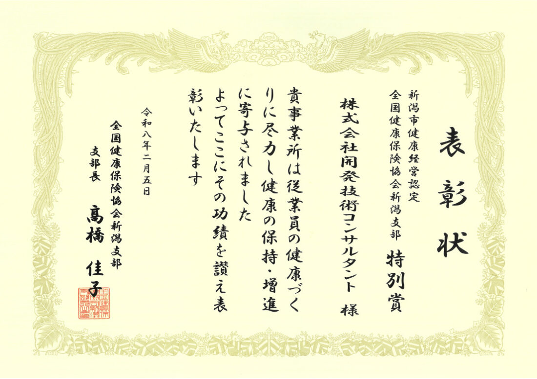新潟市健康経営認定「全国健康保険協会新潟支部特別賞」受賞!