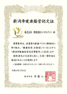 「新潟市健康経営認定事業所 ゴールドクラス」 に認定されました。
